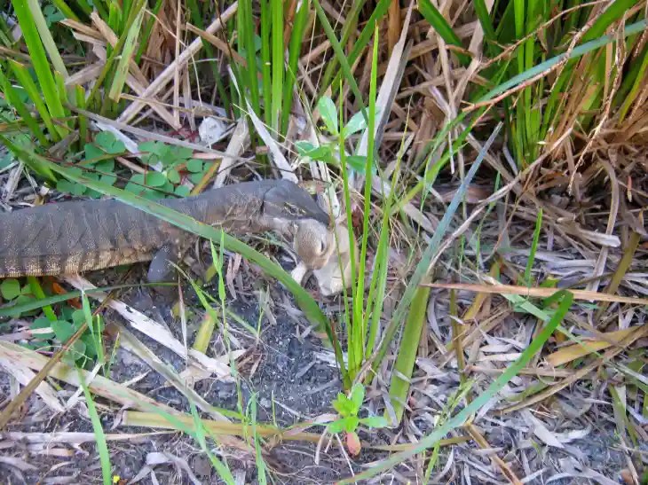 Rosenberg’s Monitor is the largest lizard in the Frenchman Bay area; adults have been known to reach 1.5 metres in length. The lizards have distinctive charcoal grey bands around their bodies and long tail. Their legs have speckled white spots. The monitors have sharp teeth to hold their prey. They should not be handled. They are relatively common and can sometimes be seen basking in the sun on bush tracks. It is possible, sometimes, to approach them to within a metre or so. The monitors will eat almost any animal of a size that can be swallowed. In the photo below, a large monitor has seized a young rabbit. Within a minute of the photograph being snapped the monitor had flipped the rabbit and swallowed it whole, head-first.